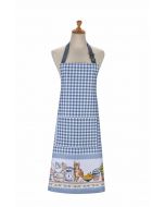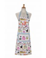 Schort Pantry cats met een rode kat, kater die in een soort voorraad kast, op planken zit tussen heel veel keukenspullen, zoals , theepot, kopjes, schalltjes , voorraadpotten, plantjes etc , de boven en onderzijde heeft een beige rand van 4 cm , het striklint heeft een grijs blauwe kleur. PVC keukenschort dus makkelijk afwasbaar. Van het bekende merk ULSTER WEAVERS uit ierland De lengte vd schort zonder lint is 80 cm de omvang zonder de striklinten is 60 cm, het lint om de hals is 60 cm lang en niet verstelbaar, je kunt er wel een klein knoopje in leggen als de schort te laag hangt