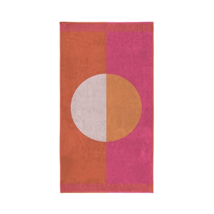 Strandlaken Colorblock circle pink, de ene helft van het strandlaken is oranje de andere helft rose , met in het midden een grote cirkel in wit en oranje, aan de boven en onderzijde zit een gestreepte rose met oranje rand van ongeveer 5 cm, de afmeting is 100x180