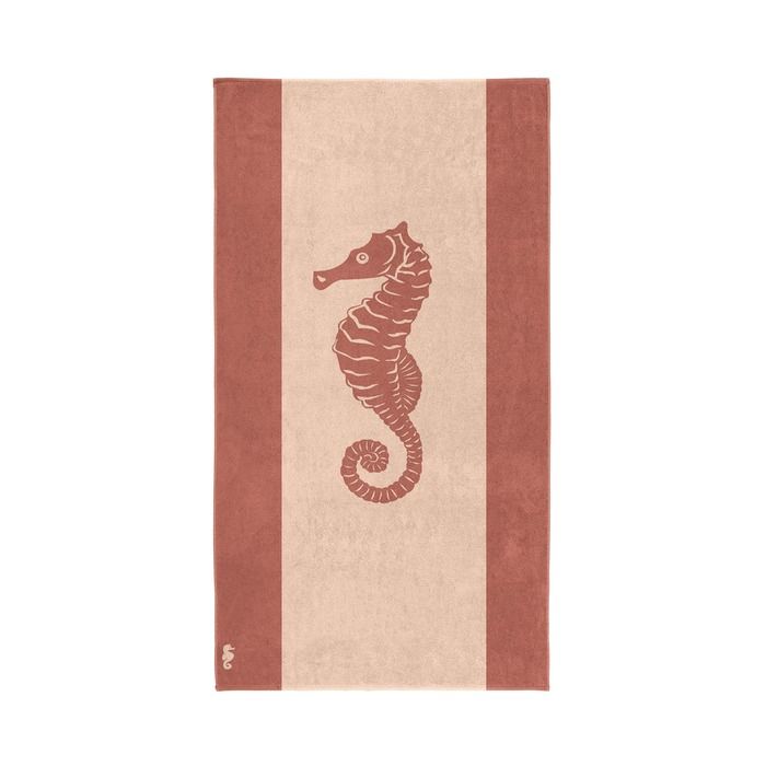 Strandlaken Flow sand, het strandlaken is zacht terra, met in het midden van de handdoek een zeepaardje en dar links en rechts van een rand van boven naar beneden in donker zand, terra kleur, de afmeting is 100x180